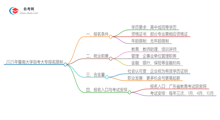 通过以上信息,希望同学们对2025年暨南大学自考大专的报名条件、就业前景、含金量、报名入口及考试安排有了更清晰的了解。这将有助于大家在选择自考道路时做出明智的决策。