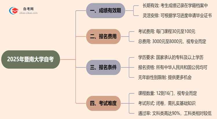 2025年暨南大学自考的成绩有效期是许多考生关注的重要问题。了解成绩的有效期、报名费用、报名条件及考试难度,可以帮助考生更好地规划自己的学习和考试策略。